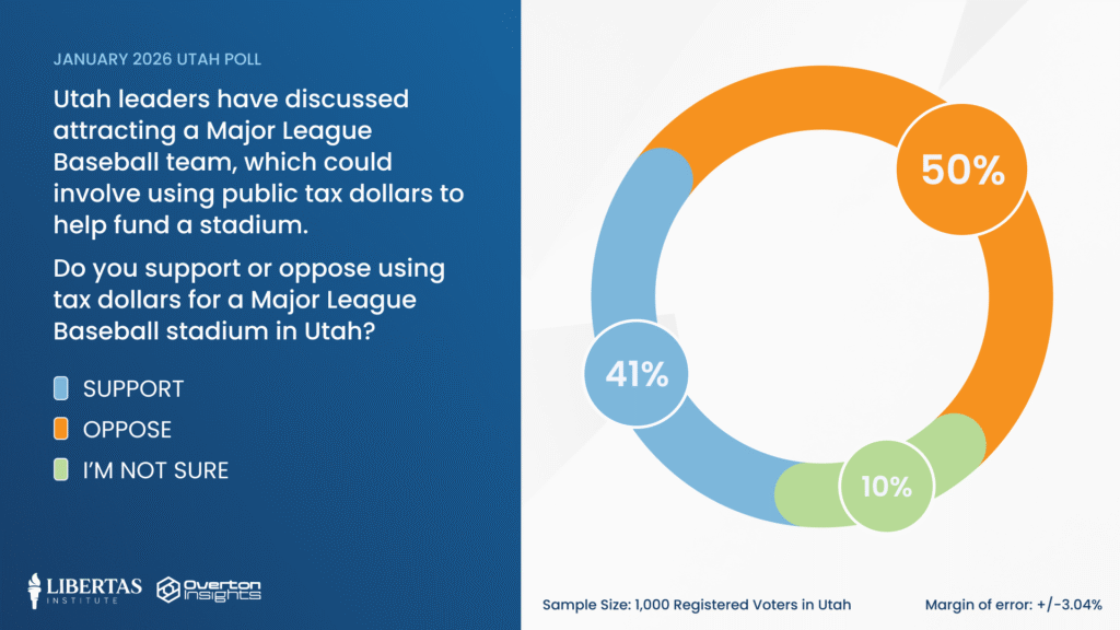 Utah leaders have discussed attracting a Major League Baseball team, which could involve using public tax dollars to help fund a stadium. Voters narrowly oppose this idea by 9 points (50% oppose vs 41% support)