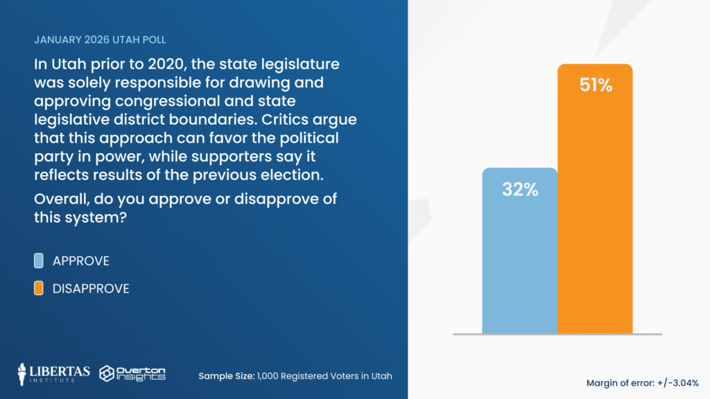 When it comes to redistricting, most Utah voters do not believe the state legislature should be solely responsible for the district boundaries because it favors the party in power. Fifty-one percent of voters disapproved of Utah’s system prior to 2020, which allowed the state legislature to set the redistricting map, while just 32% approved of it.